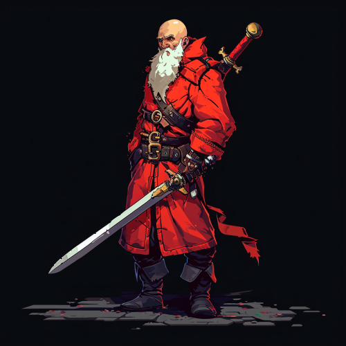 A man with a white beard and bald head wearing a red uniform using a sword in pixel ar style, rpg, dungeons and dragons, retro game, full body --v 6.0