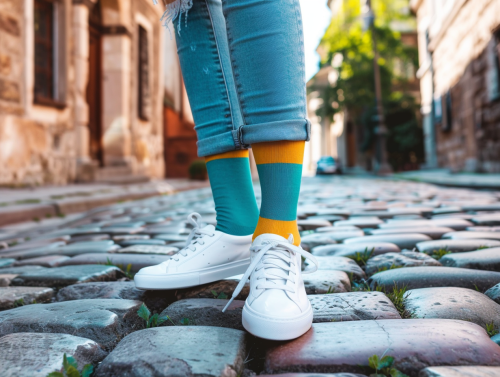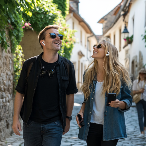 Capture a 30-year-old man and woman as tourists in a small European town. They are walking joyously along a cobblestone street, both looking upwards with smiles, wearing sunglasses. The woman is blonde with long hair, and the man is Caucasian. They are dressed in casual, comfortable outfits, suitable for sightseeing. Both are wearing Apple AirPods and holding smartphones. The image is crafted with a photographic portrait quality. The scene is captured in photorealistic detail using a 35mm lens at f/1.8 aperture, creating a shallow depth of field. This keeps the subjects' features sharp while softly blurring the background, emphasizing the atmosphere and their expressions. The image is beautifully color corrected for a cinematic look. Settings include: 35mm, f/1.8, 8k resolution, hyper-realistic texture aspect ratio 4:7