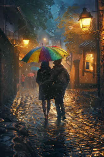 realistic image, A couple walking down a cobblestone street, sharing a colorful umbrella as rain softly falls around them. The streetlights glow through the mist, and they are laughing together as they splash through puddles. Their clothes are slightly damp, but they are lost in the moment, smiling and carefree --v 6.0 --ar 2:3