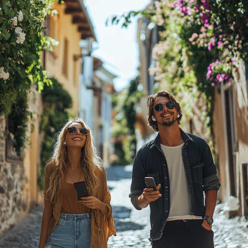Picture a man and a woman, both 30-year-old models, as tourists in a charming small town in Europe. They are walking down a street paved with cobblestones, smiling and looking upwards, each sporting sunglasses. The woman has long blonde hair, while the man is Caucasian. Their attire is casual and comfortable, perfect for a day of exploration. They are each using Apple AirPods and holding smartphones. This photorealistic image is captured with a 35mm lens at f/1.8 aperture, producing a shallow depth of field that sharpens their features while gently blurring the background to highlight their expressions. The image is beautifully color-corrected with a cinematic touch, utilizing 8K resolution for hyper-realistic detail. The aspect ratio is set at 4: