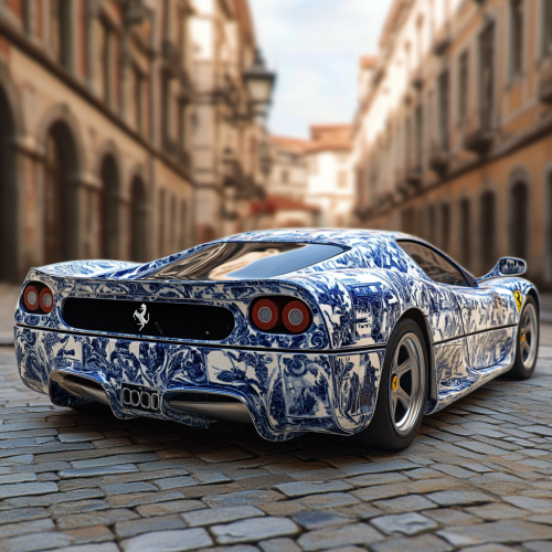 Generate an photorealistic image of a Ferrari F50 with its body covered in traditional Portuguese azulejo tiles. The car’s sleek, aerodynamic design should be intricately adorned with detailed blue and white tile patterns, including floral motifs, historical scenes, and geometric shapes typical of Portuguese azulejos. The glossy ceramic texture of the tiles should catch the light, giving the Ferrari a unique fusion of luxury and art. The background can feature a classic European setting, such as a cobblestone street or a historic square, to complement the cultural richness of the car's azulejo-inspired design, --v 6.1