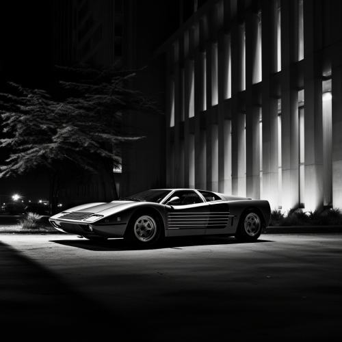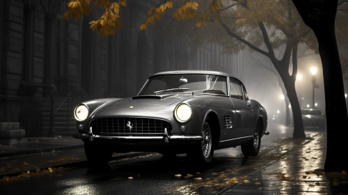 grey 1963 ferrari 250 GT SWB Berlinetta in a foggy misty street at night, a beautiful 30-year old woman with long hair behind the steering wheel, autumn, leaves on the street, Tribeca style, ten people walking in the street dressed classy, a couple of other classic cars parked in the street, hyper realistic black & white picture, hasselblad, high resolution --ar 16:9