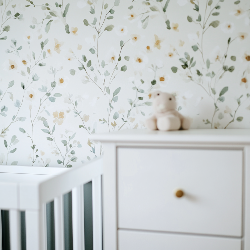 A close-up view of a nursery wall with a designated central space for the wallpaper. In the background, a hint of a white crib or a small, simple dresser is visible, softly blurred to keep the wallpaper pattern in clear focus. The clean and minimalistic setting helps highlight the details of the wallpaper, with even, natural lighting to enhance visibility.
