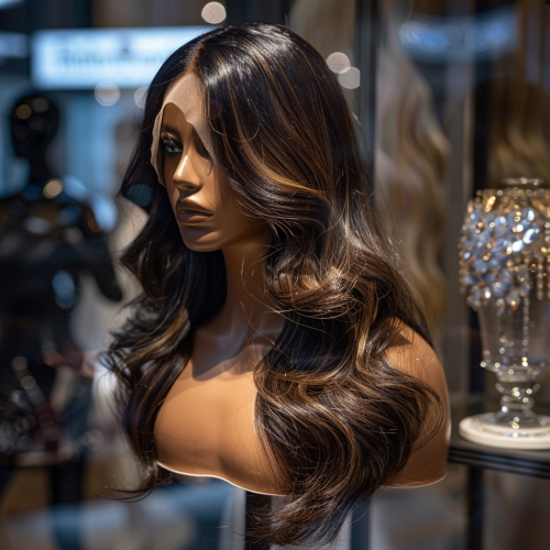30-inch body wave lace front wig on a mannequin head in a hair salon, with long, dark brown, wavy hair styled with baby hairs and a side parting, on display in the shop window, with a blurred background of a high-end hair salon. The hair is in focus, with beautiful, soft lighting, detailed and vibrant, as if from a professional hair photoshoot. --v 6.0