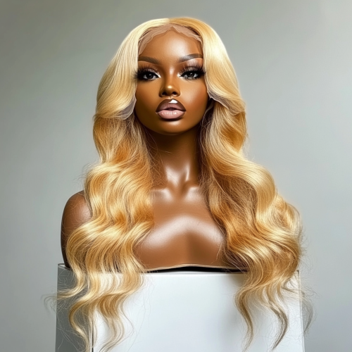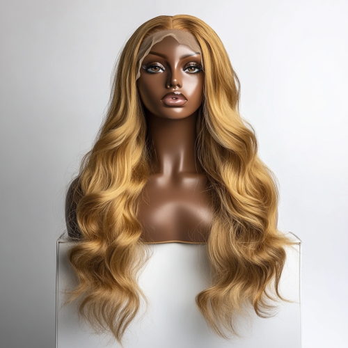 Capture a front view of a luxurious Brazilian body wave HD lace front wig in stunning professional studio quality, featuring a vibrant honey blonde color. The wig, showcasing 250% density and an impressive length of 40 inches, should exude silky smoothness. Position the wig on a mannequin designed to represent the natural skin tone of black women. Ensure the wig is displayed full-length on a white display box, with the lace visible yet appearing realistic and flawless. Utilize white background and professional studio lighting to highlight the texture, shine, and dimensional color gradient of the human hair wig for commercial use of the highest caliber.