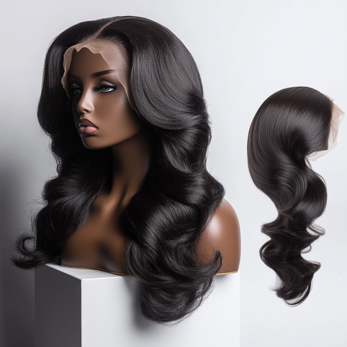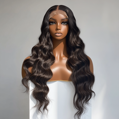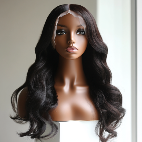 Capture a high-definition stock photo of a UNice 13x4 Lace Front Body Wave Transparent Lace Wig on a mannequin. The mannequin should represent a black woman with any skin tone. Style the wig with a deep side part, and ensure the focus is on the realistic appearance of the transparent lace front. The background should be a white studio setting with excellent lighting to highlight every detail of the wig and lace.