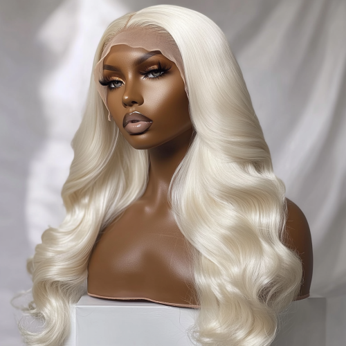 Capture a front view of a luxurious Brazilian body wave HD lace front wig in stunning professional studio quality, featuring a vibrant platinum blonde color. The wig, showcasing 250% density and an impressive length of 40 inches, should exude silky smoothness. Position the wig on a mannequin designed to represent the natural skin tone of black women. Ensure the wig is displayed full-length on a white display box, with the lace visible yet appearing realistic and flawless. Utilize white background and professional studio lighting to highlight the texture, shine, and dimensional color gradient of the human hair wig for commercial use of the highest caliber.