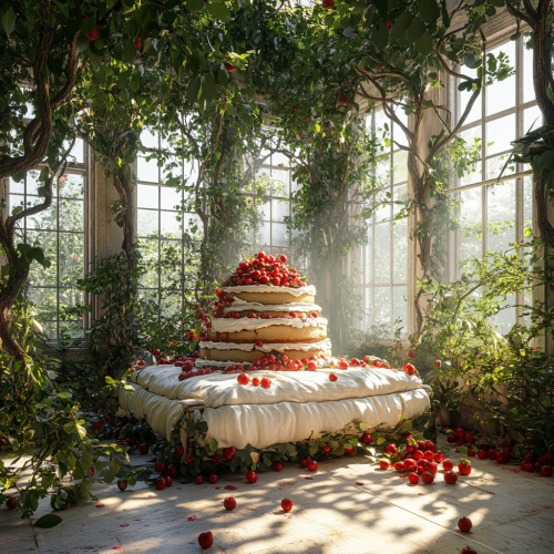 A whimsical and surreal indoor bedroom scene where the bed is designed like a giant layered cake, topped with cream, cherries, and berries. The room is overgrown with cherry trees, their branches heavy with fruit, spilling into the space. Large windows fill the room with sunlight, and the atmosphere is dreamy and fantastical, blending elements of nature, luxury, and imagination. The overall style is detailed and ethereal, with soft lighting and lush greenery surrounding the scene.