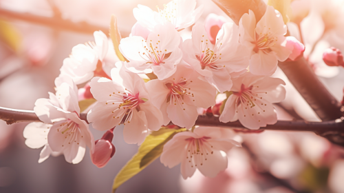a photography, cherry blossom, sunlight on tree, pastel tone, realistic, detailed, extremely close-up shot, light reflection, 8k, Chiaroscuro, --v 5.2 --style raw --ar 16:9