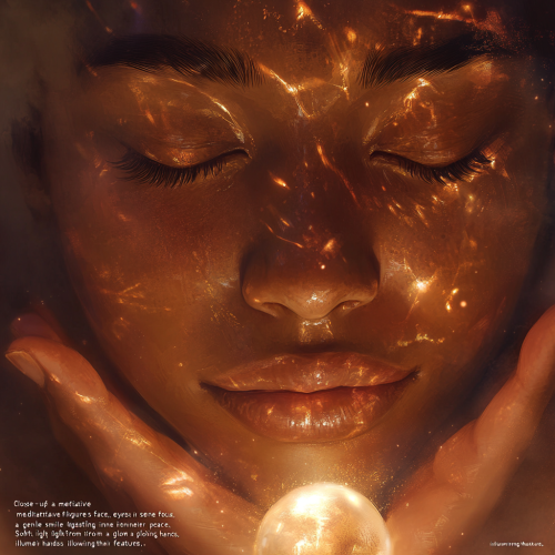 "Close-up of a meditative figure's face, eyes closed in serene focus, a gentle smile suggesting inner peace. Soft light from a glowing orb in their hands illuminates their features."