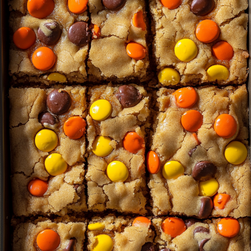 Create a close-up image of freshly baked cookie bars in a rectangular baking pan. The bars are golden brown, dense, and filled with vibrant Reese's Pieces in orange, yellow, and brown colors scattered across the top. The texture of the cookie bars is slightly crinkled, with a gooey center and crispy edges, giving a homemade, warm feel. The Reese's Pieces candies add a colorful and festive look, with some pieces slightly melted into the cookie surface. The image should evoke a cozy, inviting atmosphere, perfect for a sweet treat