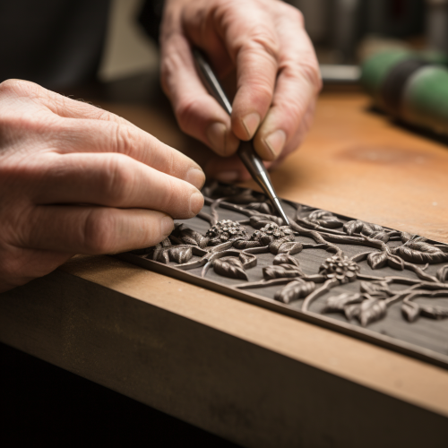 "Provide a close-up view of the metal bars that are engraved to look like vines. They should be spaced about four inches apart, not wide enough to allow a body to pass through but ample for a hand to reach out."