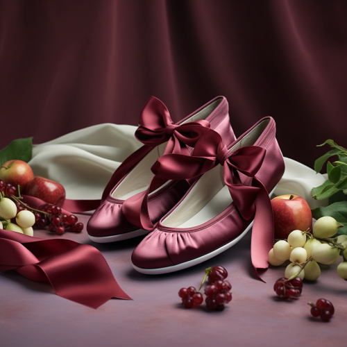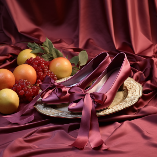 christmas fashion advertisement for burgundy satin ballet flats on a plate with ribbons and fruits around it. photoshoot editoral product placement. haute couture. hyperrealistic. minimal. hi fidelity. jacquemus style.