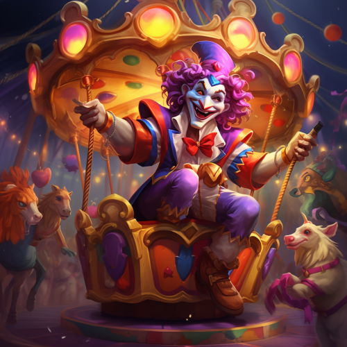 a carousel with clowns riding it, colorful, funny, cute, happy, league of legends artstyle