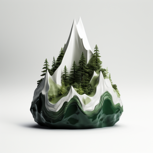 It's a product that has a high triangular cone with a gray rock texture, makes it look like a dark green forest at the top, and a river passes through the middle of the product. It's white with no background