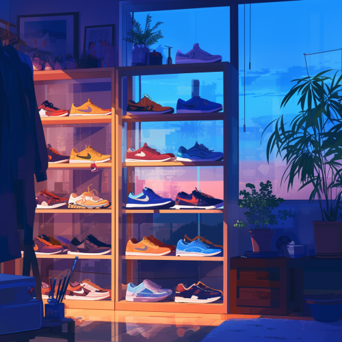 lofi, Display cabinet full of colorful sneakers, wall of art. Lit by light from window. Sundown --niji 5