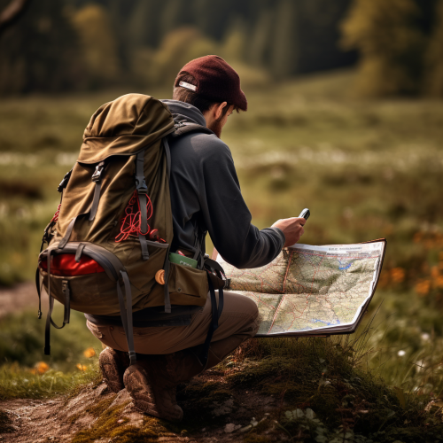 orienterer reading map with backpack on ready for journey outside