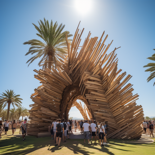 The entrance to the wide festival and music event is made from roughly assembled scrap wood. Width 15 meters, height 10 meters, thickness 1 meter, with walls made from scrap wood not very thick. It's on the side, 2 meters high, and the grass is short. There were a few palm trees and many people. zoom out x 3.