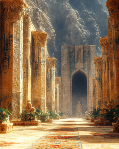 desert pyramids in the background, a lot of green plants, sunrise on the right, focus on the light, rule of thirds, hyper realistic, --ar 16:9