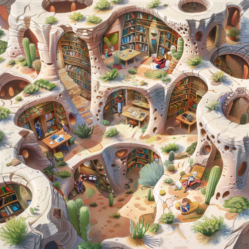 intricate images of a Pueblo style home that is fantastical and beautiful in a fantasy style rendering. The landscape should be a true desert scene with cacti, succulents and sagebrush. Inside the home should have open spaces filled with book shelves and books, and a table with open books, computers, and cell phones along with writing materials. The people inside should be laughing and enjoying themselves.