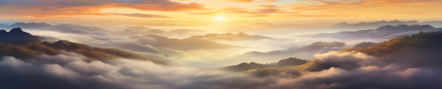 A serene landscape at sunrise, with soft golden light illuminating a peaceful valley, small streams reflecting the morning glow, and distant mountains framed by clouds. The scene conveys tranquillity, mindfulness, and an appreciation of nature's subtle beauty.