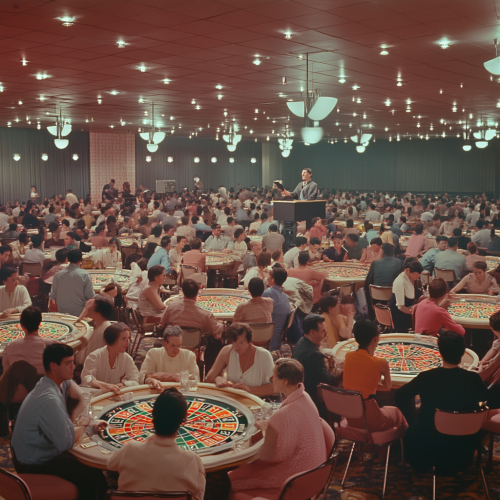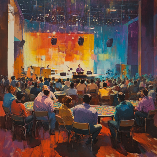 A large bingo hall with filled with people at tables, a bingo caller sitting on a stage, in the late evening, 1960s era, mid-century modern painting style, medium vibrancy, diversity_penalty (1), temperature (0.7), top_p (2)