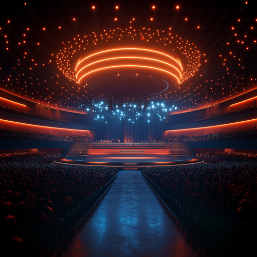 a background tech theme sports event space hall with various sports ornaments and crowd at the side, olympics, center, wide shot, medium lighting, cinematic, dynamic color --v 6.1 --s 250