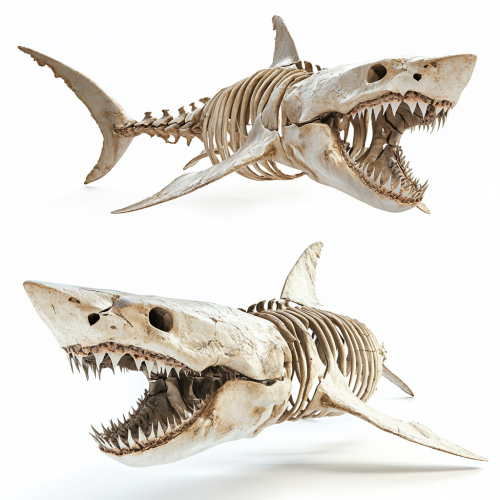 front perspective view and rear perspective view of a large great white shark skeleton with its mouth open as if its going in for a bite; front and rear perspectives for each picture;realistic lighting;high resolution;isolated on white background with clipping path