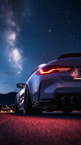 Real life looking mobile wallpaper of rear view, a modified wide body kit BM4 M4 Competition car driving on the road, night time, with Milkyway on the night sky,Ultra realistic,Color Grading, portrait Photography, Depth of Field, hyper-detailed, beautifully color-coded, insane details, intricate details, beautifully color graded, Unreal Engine, Cinematic, Color Grading, Editorial Photography, Photography, Photoshoot, Shot on 70mm lens, Depth of Field, DOF, Shutter Speed 1/1000, F/2, White Balance, 32k, up to scale max,overall I can't believe how stunning this wallpaper is. It's so beautiful, amazing and wonderful. --ar 9:16 --v 6.1