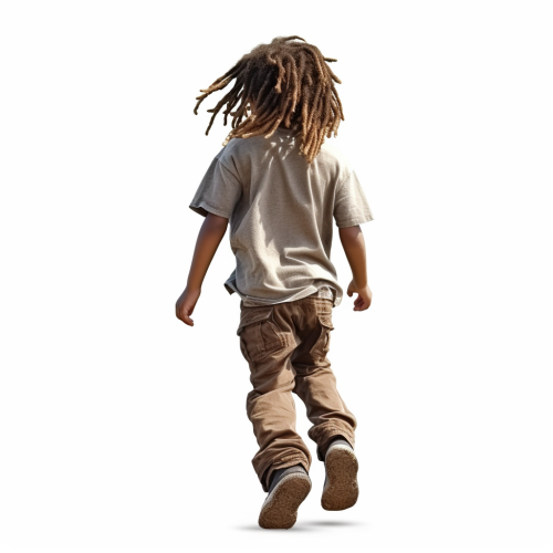 kid with dreads running, boy, isolated white background, realistic 4k, rear point of view, shot from behind, straight rear point of view, shot from exactly behind the object
