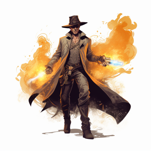 a gunslinger with magic runes glowing on their duster jacket, fantasy art, in the style of Frank Frazetta, action pose, full body view, no background, vector image, high rez --v 5.0