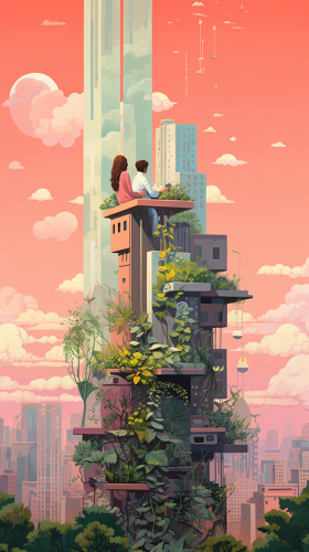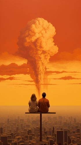 a couple in love sits on the roof of a skyscraper, and below is the end of the world and a city overgrown with a jungle and a nuclear mushroom, Wes Anderson style, a little abstraction, --ar 9:16