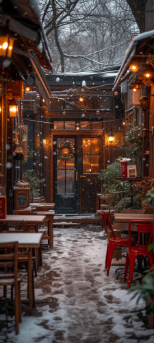 realistic photo of a cozy empty cafe on a snowy day with warm cinematic lighting at 24mm, 50 megapixels, DPI 300, --ar 9:20 --s 750 --v 6.0 --style raw