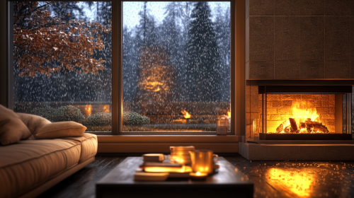 Ultra-realistic photo of a soothing, cozy interior, capturing the warmth and tranquility of an autumn evening spent by the fireplace. The room is softly lit by candles and lanterns, with warm tones of autumnal colors like deep oranges, browns, and golds. The flickering glow from the fireplace casts gentle shadows, creating an inviting atmosphere. The ambiance evokes the peacefulness of falling leaves, the gentle crackle of burning candles, and the comforting, reflective mood of a quiet, serene evening. 8k --ar 16:9 --s 750 --v 6.0