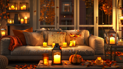 Ultra-realistic photo of a soothing, cozy interior with sofa, caffe table, capturing the warmth and tranquility of an autumn evening spent by the fireplace. The room is softly lit by candles and lanterns, with warm tones of autumnal colors like deep oranges, browns, and golds. The flickering glow from the fireplace casts gentle shadows, creating an inviting atmosphere. The ambiance evokes the peacefulness of falling leaves, the gentle crackle of burning candles, and the comforting, reflective mood of a quiet, serene evening. 8K --ar 16:9 --v 6.0