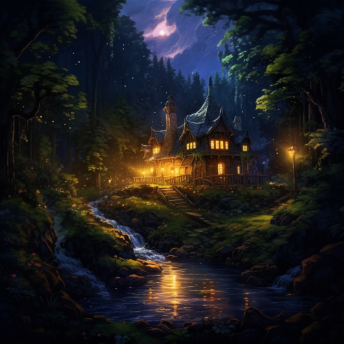 Deep forest outpost, dungeons and dragons style Dark Fantasy, foggy and rainy forest. An outpost sits above a trail, rain falls and the roof sheds the water down into a creek. The outpost is small but looked after, cozy and comftable with smoke coming from word burning stove --ar 7:4