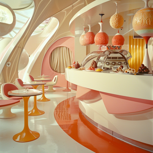 Unmanned. A space without people. Illustration from the 80's. Planar. The contour lines are thick and soft. Retro illustration. Pastel colors. Retro atmosphere. A cozy cafe with colorful posters. cute. Ice cream and coffee are on the table. Fashionable and pop. --ar 3:4