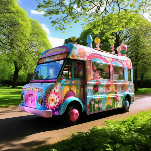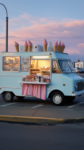 the ice cream seller's car is parked in our park parking lot and selling ice cream, realiatic, photography, --ar 9:16