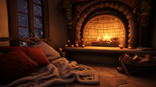 3d realistic 8k warm winter cozy very detailed sharp cute hobbit fireplace. warm red colours, beautiful window, night, carpet, candles, warm atmosphere, very realistic, unreal engine 5, 3d max render --ar 16:9 --s 50 --style raw