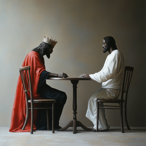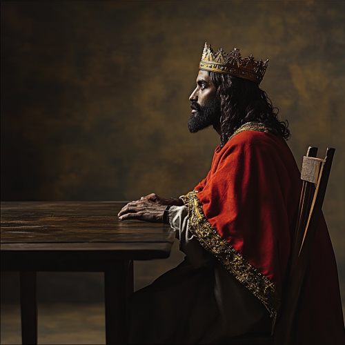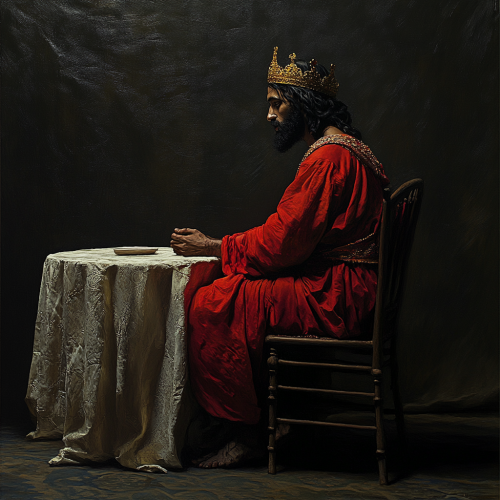 Jesus dressed as a king, red cape, crown, sitting at a 2-seater dining table, with the other empty chair in front of him. He is waiting for the other person, but he hasn't come. Side view, side image position. Dark-skinned, Jewish-looking Jesus, in profile looking at the empty chair in front of him. 8k.