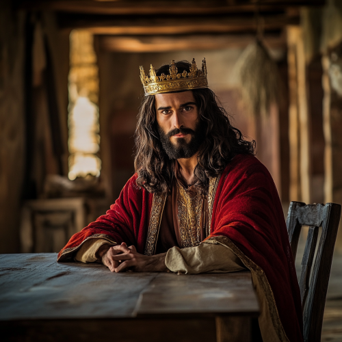 An open, realistic scene, as if taken with a 50mm lens, with a blurred background. Jesus, dressed as a king, golden crown, red cloak, sitting at a 2-seater table, with an empty chair in front of him. Jesus of Jewish appearance.