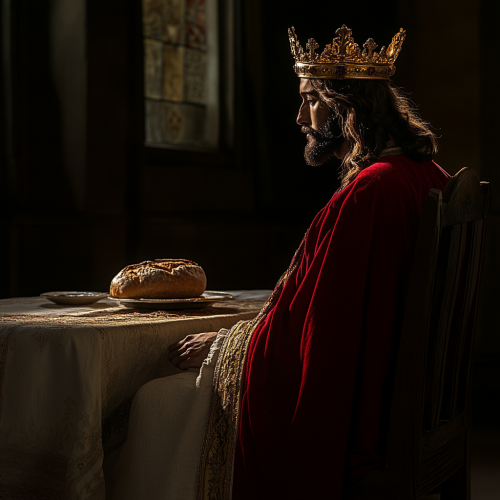 Jesus the King, golden crown, red cape sitting at a small dining table waiting for a guest who did not come, the chair is empty. Side view, side image position. Dark-skinned, Jewish-looking Jesus, in profile looking at the empty chair in front of him. ultra quality photography, 8k. on the table there is a loaf of bread and 2 plates