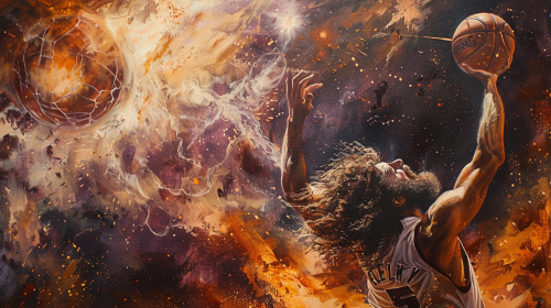 An expressive oil painting of a basketball player dunking, depicted as an explosion of a nebula.