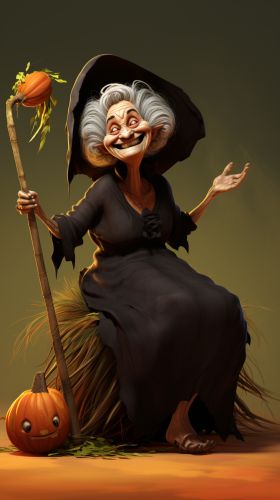 friendly witch, sitting on a vietnemese broom, friendly, grandmotherly smile, in art style of pixar, full body --ar 9:16