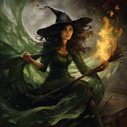 Woman with black hair and green skin sits on a broom and flies through the air. She is wearing a black pointed hat. romantic. green skin