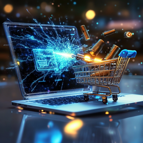Create an image of a laptop computer with a small shopping cart placed on its keyboard. A bolt is emerging from the screen of the laptop and is about to drop into the shopping cart. The overall scene should convey the concept of e-commerce, specifically a website that sells screws and bolts. The background should be simple and clean, focusing attention on the laptop, the bolt, and the shopping cart. sparkle, magic aptmosphere. future sensation. futuristic.