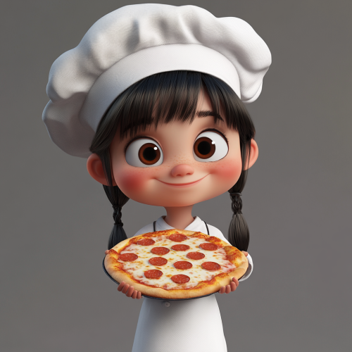 little girl, 5 years old, chef hat, holding pizza, cheesy pizza, pixar style, animation, cartoon, 3d, plain background, having fun, cute, grey background, full body view