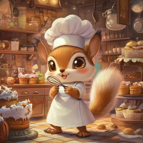 A cute chibi squirrel dressed as a pastry chef, with a tiny white chef’s hat perched between its fluffy ears and a small apron tied around its waist. The squirrel stands proudly in a cozy bakery, holding a whisk in one paw and an acorn-shaped cake in the other. The background features a warm, inviting kitchen filled with delicious pastries, cakes, and cookies, along with rustic wooden shelves and colorful baking ingredients, highlighting the squirrel’s playful and creative baking skills. 4K, HDR, highly detailed