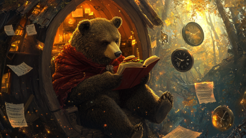 A majestic bear wearing a tattered red cape sits inside a cozy doghouse, holding a sandwich with focus, surrounded by swirling papers, glowing books, and floating musical notes. The background features flowing clocks, gears, and the soft glow of a sunrise, symbolizing a productive day of balance, work, and reflection. The scene radiates calm energy, with playful, surreal elements weaving throughout to represent creativity and daily routines --ar 16:9 --v 6.1 --style raw