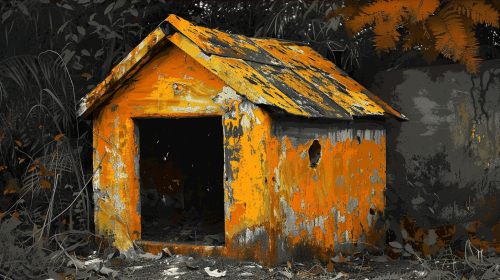 a doghouse. in the style of a painting. orange and yellow colors, with blacks, greys and whites. --ar 16:9